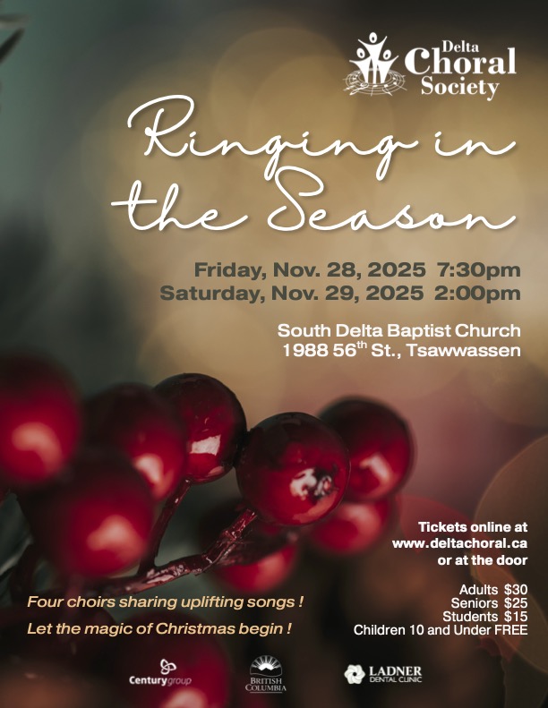 The Delta Choral Society is a beloved non-profit organization that brings the joy of music to the Delta community. Known for its vibrant vocal sound and diverse repertoire, the Society features several choirs: the Delta Concert Choir for adults, the auditioned Delta Chamber Choir, and opportunities for all school-age children in the Children and Youth Choir.
